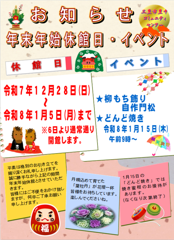 豊中コミュニティセンター:12/28(日)~1/5(月)年末年始休館日。